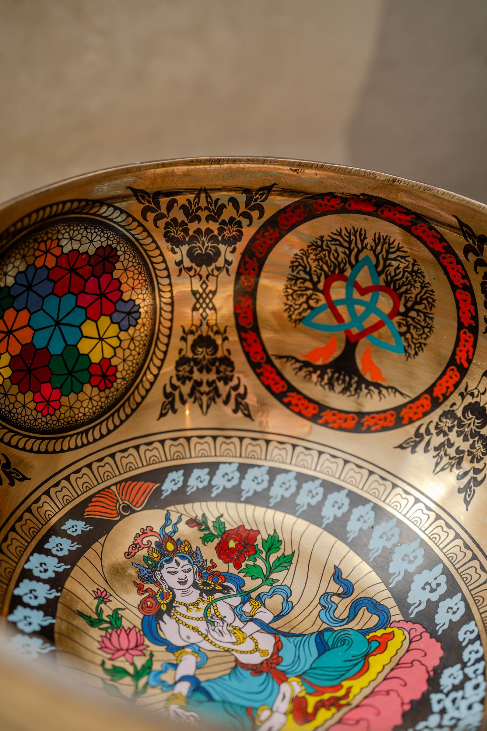 This White Tara Singing Bowl embodies compassion, healing, and serenity. White Tara is revered as the goddess of longevity, protection, and pure awareness, symbolizing nurturing energy and spiritual clarity. Her presence on this bowl supports calmness, emotional healing, and mindful awareness, making it ideal for meditation, prayer, and sound therapy.