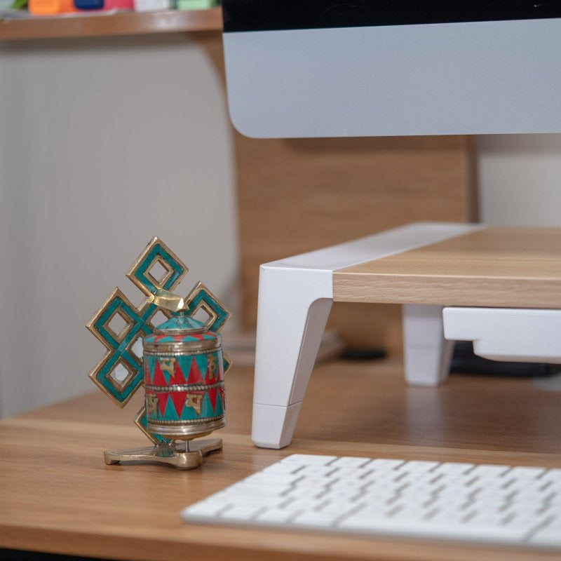 Similar to other prayer wheels, this Turquoise Endless Knot Prayer Wheel follows the same philosophy. A scroll of paper or cloth that has mantras, sutras, and prayers inscribed on it is securely wound within the cylinder. The sacred phrases inside are summoned when it is rotated counterclockwise, releasing waves of uplifting energy and bestowing blessings.