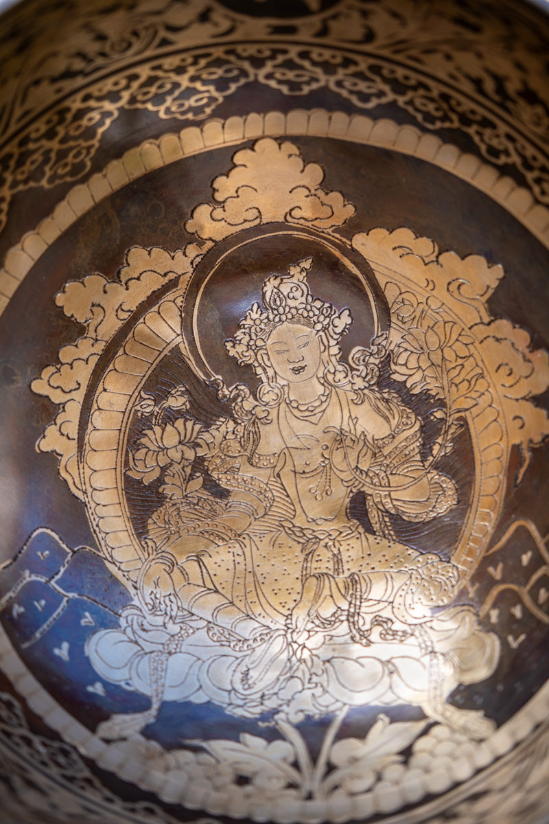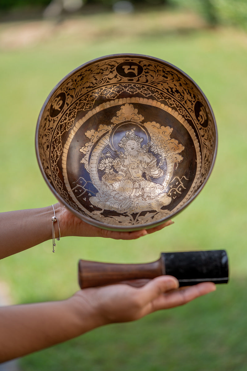 3. Artisanal Craftsmanship: Handcrafted by skilled artisans using traditional techniques, our Green Tara Singing Bowl is a masterpiece of craftsmanship and devotion, perfectly crafted for unmatched quality and authenticity.
