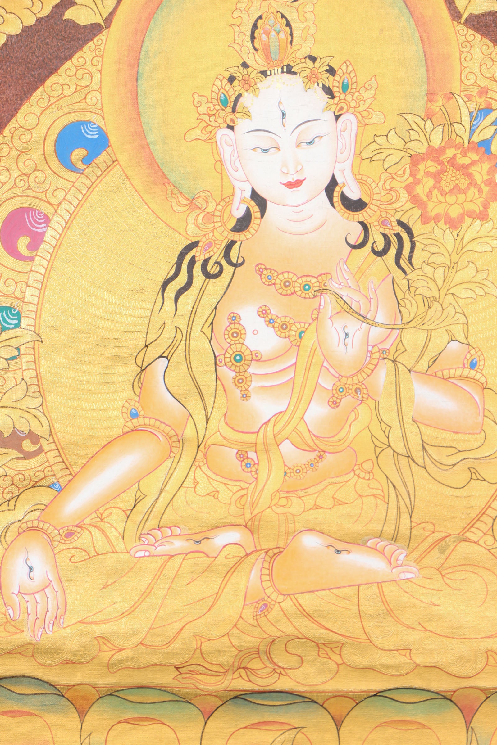 The central figure in this thangka showcases the depiction of White Tara, surrounded by the divine presence of the Pancha Buddha above her and the benevolent energies of Amitayus and Namgyalma below her. This sacred artwork epitomizes compassion, healing, longevity, and spiritual transformation. With its intricate details and sacred symbolism, the thangka invites deep contemplation and connection with the spiritual realm.