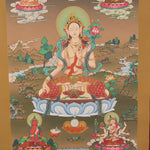 White Tara is the female Bodhisattva of compassionate activity, the supreme mother and collective manifestation of the enlightened activity of all the Buddhas. She is said to see all suffering and respond to requests for help. Her yogic method promotes health and extending one's lifespan. The reasons behind the choice of a Buddhist thangka are many and are mostly related to our state of mind. Each deity in thangka painting represent a unique quality which we meditate upon. While we meditate looking at the painting we try to be one with the deity in order to bring the good quality inside us.