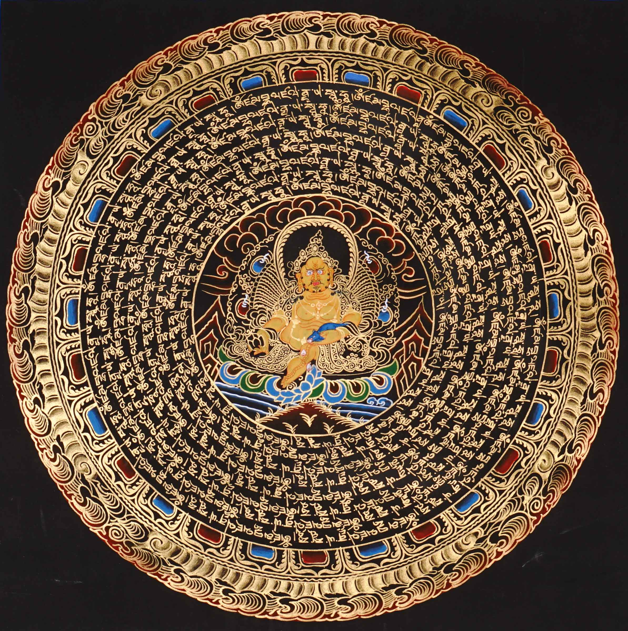 The mandala places Zambhala at the center, surrounded by concentric circles of sacred Tibetan script and symbolic decorative borders. This circular arrangement creates a meditative visual rhythm, drawing the eye inward toward the deity while expressing the radiating power of mantra, blessing, and spiritual abundance.