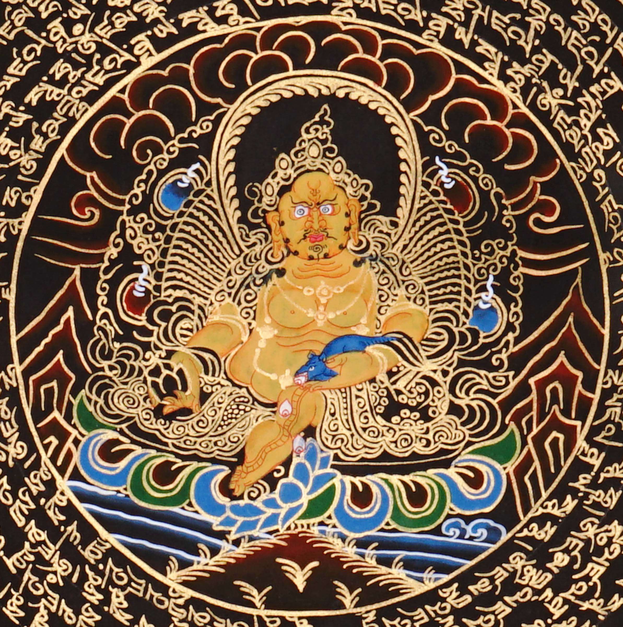 Zambala Mandala Thangka painting with central prosperity deity, sacred Tibetan script, and traditional Himalayan Buddhist symbolism.