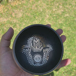 Discover the powerful energy of our Hamsa Singing Bowl. This 4 inch Singing Bowl is carefully handcrafted and adorned with an intricately etched Hamsa symbol, using a traditional etching technique. Made by skilled Nepalese artisans in the Himalayan Foothills, each bowl is uniquely crafted with hand hammering.