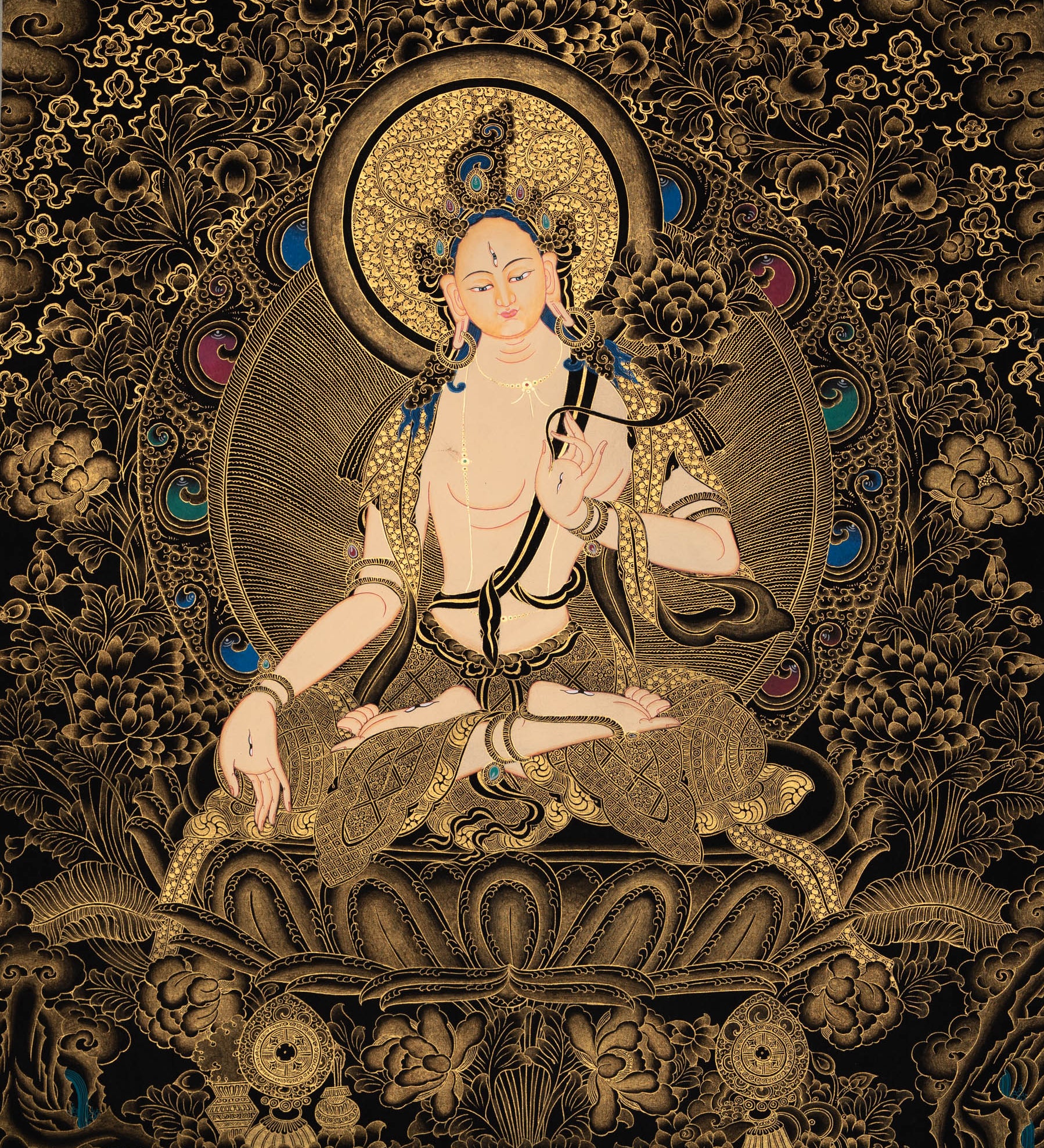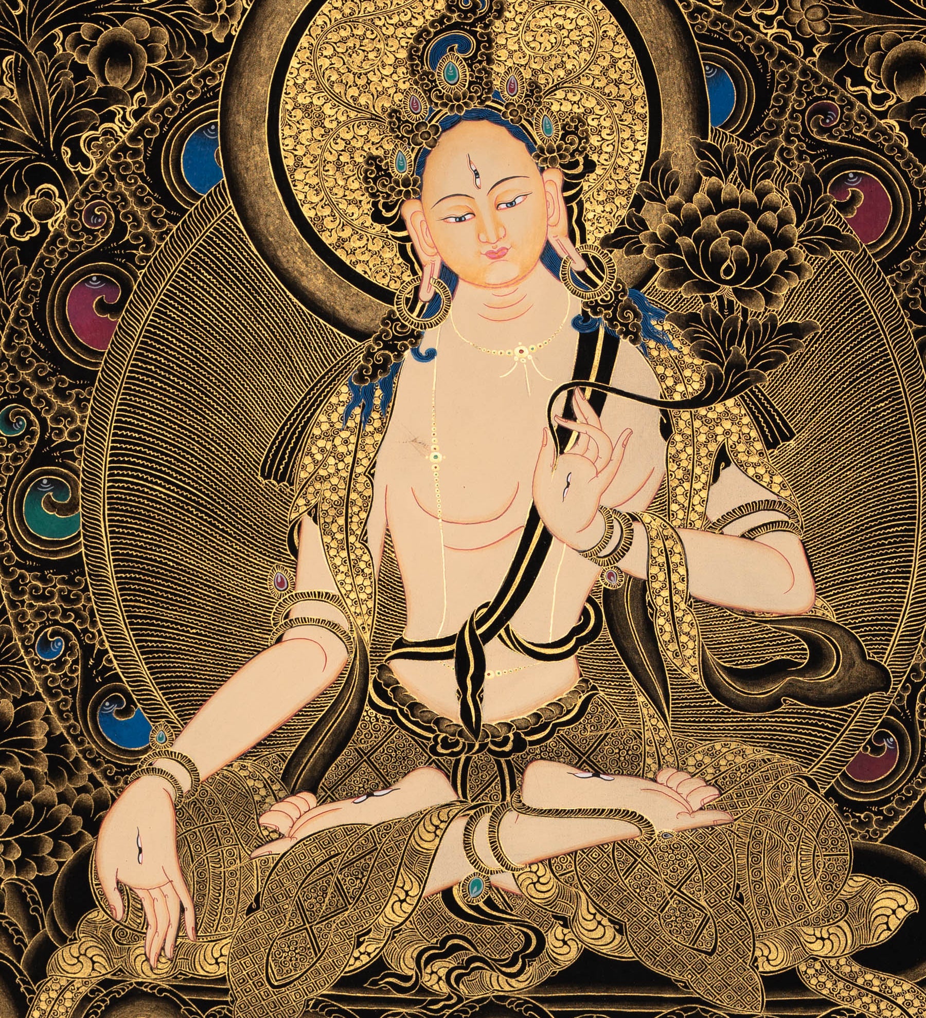 The word ‘Thangka’, means ‘that which can be rolled up’, as it was a scroll in form, which could be easily carried by itinerant monks and used as a teaching tool or to give a sense of protection to the traveller. To this day Buddhist Lamas use these scroll artworks in their ceremonies. They are to be found in shrine rooms and temples as a focus for devotional practice of meditation or in people’s home to ward off misfortune.
